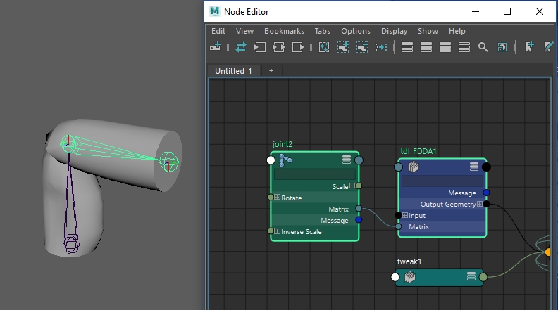 cmds.deformer(type=’tdl_FDDA’)A deformer will be created and connected to the geometry, now plug Joint2’s matrix to the deformer and voila. You should see the magic.
