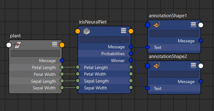 In the first tutorial of this series, you learned how you can train a Neural Network to classify any group of scalar values in your Maya scene. You have seen how this works in the example of a procedural flower from which parameters can be used to classify its type. In that first tutorial, the classification was done from within Maya’s script editor. Now you have learned how to do the same computation directly inside Maya’s dependency graph. This means you can use your Neural Network’s output to drive any other node in Maya interactively! In the image above you can see these outputs influencing annotation objects, but these could be any other Maya nodes. I hope you can see the potential in this.