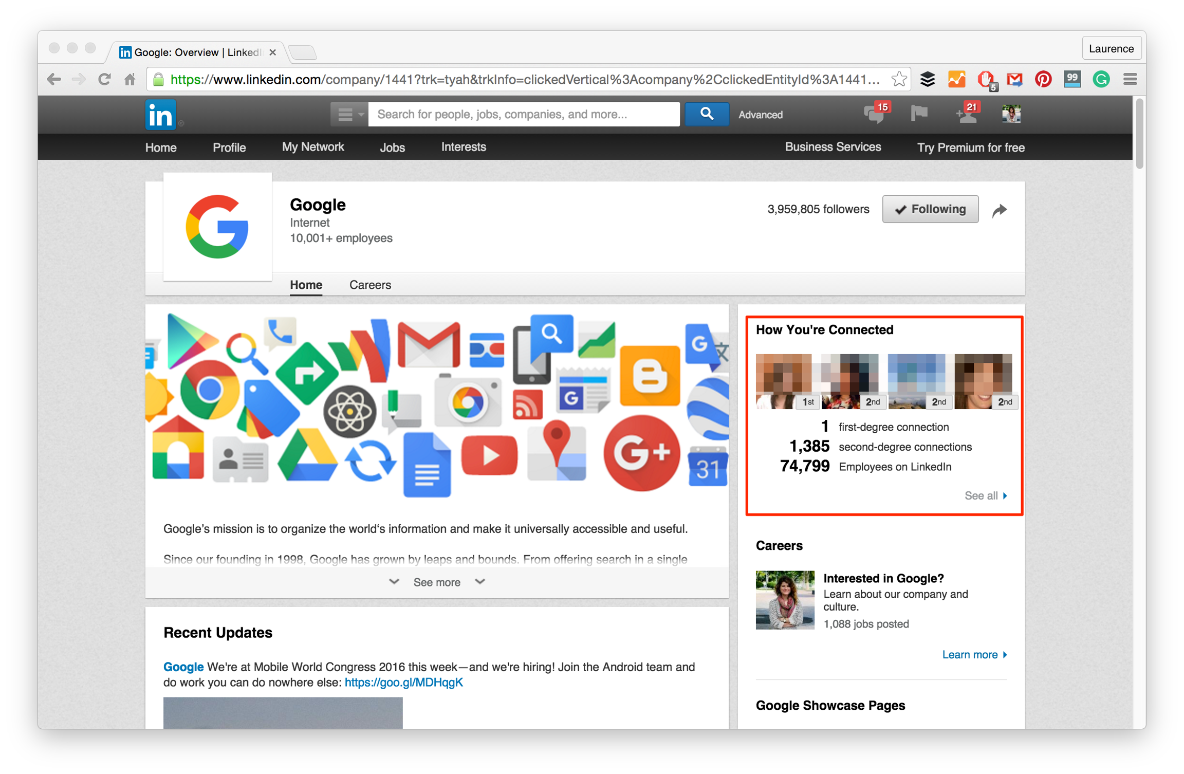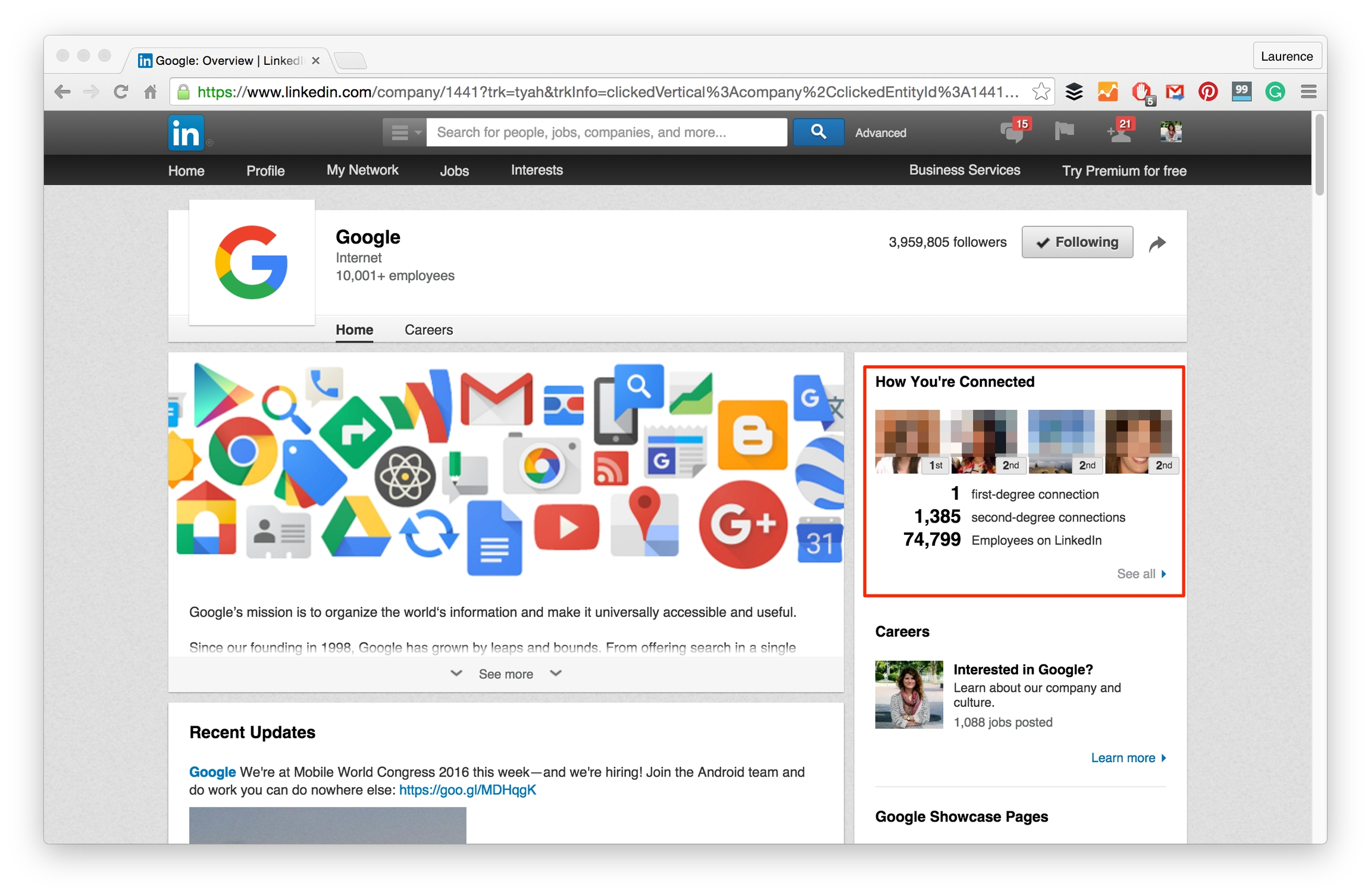 As you can see above, when you visit a company page on LinkedIn it will show who you know that works at that company. It will also show any second-degree connections you have that work at the company. So, even if you don’t have a direct contact at the company, you can still use second-degree connections as a way in. The way to do this is by asking your first-degree connection for an introduction.