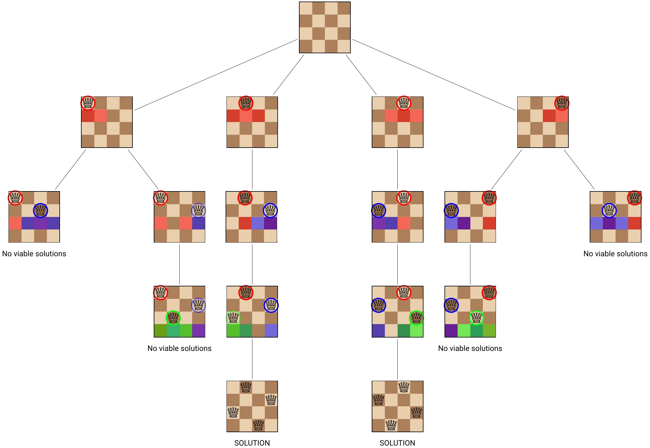 Here are the states that the backtracking algorithm explores for a 4x4 board. Note that naively there are 4! = 24 complete configurations with 4 queens on the board, if we place the queens row-by-row, and avoid reusing a column that is already used. With backtracking, many configurations are eliminated early. This algorithm shows all solutions, instead of stopping at the first one found.