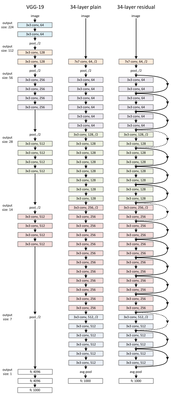 The authors of [2] argue that stacking layers shouldn’t degrade the network performance, because we could simply stack identity mappings (layer that doesn’t do anything) upon the current network, and the resulting architecture would perform the same. This indicates that the deeper model should not produce a training error higher than its shallower counterparts. They hypothesize that letting the stacked layers fit a residual mapping is easier than letting them directly fit the desired underlaying mapping. And the residual block above explicitly allows it to do precisely that.