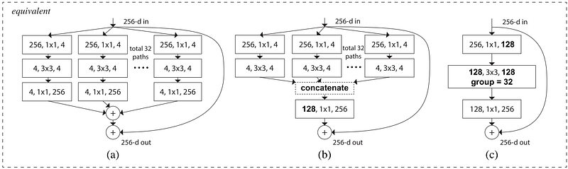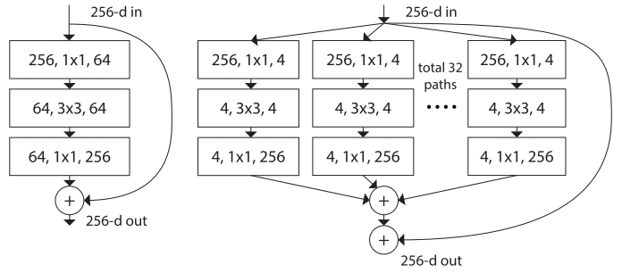 Xie et al. [8] proposed a variant of ResNet that is codenamed ResNeXt with the following building block:left: a building block of [2], right: a building block of ResNeXt with cardinality = 32