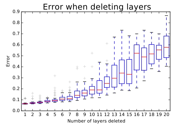 Given the above finding, it is quite clear why removing a couple of layers in a ResNet architecture doesn’t compromise its performance too much — the architecture has many independent effective paths and the majority of them remain intact after we remove a couple of layers. On the contrary, the VGG network has only one effective path, so removing a single layer compromises this one the only path. As shown in extensive experiments in [14].