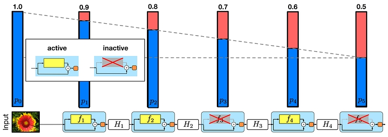 Formally, let H_l be the output of the l_th residual block, f_l be the mapping defined by the l_th block’s weighted mapping, b_l be a Bernoulli random variable that be only 1 or 0 (indicating whether a block is active), during training:![]()
