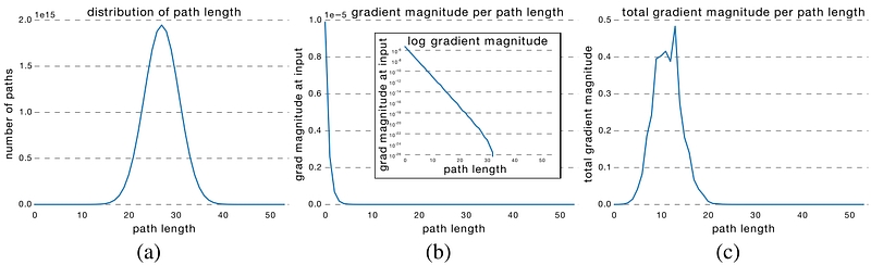 We can now multiply the frequency of each path length with its expected magnitude of gradients to have a feel of how much paths of each length contribute to training, as in (c). Surprisingly, most contributions come from paths of length 9 to 18, but they constitute only a tiny portion of the total paths, as in (a). This is a very interesting finding, as it suggests that ResNet did not solve the vanishing gradients problem for very long paths, and that ResNet actually enables training very deep network by shortening its effective paths.
