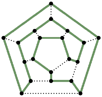 An Hamiltonian path is a path in an undirected or directed graph that visits each vertex exactly once. A Hamiltonian cycle (or circuit) is a Hamiltonian path that is a cycle. Note for computer scientists: Generally, it is not not possible to determine, whether such paths or cycles exist in arbitrary graphs, because the Hamiltonian path problem has been proven to be NP-complete. It is named after William Rowan Hamilton who invented the so-called "icosian game", or Hamilton's puzzle, which involves finding a Hamiltonian cycle in the edge graph of the dodecahedron. Hamilton solved this problem using the icosian calculus, an algebraic structure based on roots of unity with many similarities to the quaternions, which he also invented.