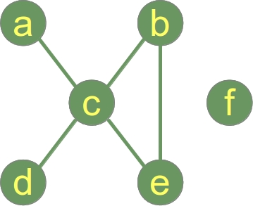 [('a', 'c'), ('c', 'a'), ('c', 'b'), ('c', 'd'), ('c', 'e'), ('b', 'c'), ('b', 'e'), ('e', 'c'), ('e', 'b'), ('d', 'c')]As we can see, there is no edge containing the node "f". "f" is an isolated node of our graph. The following Python function calculates the isolated nodes of a given graph: