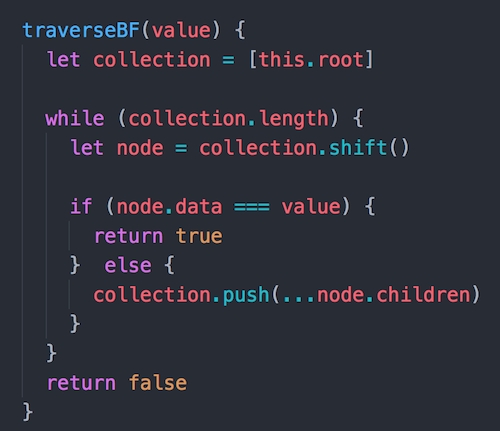After building the DFS function, the BFS function will look very similar, but with one small difference. When we use the BFS approach, we want to check all sibling elements before going to the next row of the tree. We will accomplish this by using a Queue. The Queue requires us to use the push method instead of the unshift method when handling the children of the node. Instead of taking the children of a node and setting them into the front of the collections array, we will instead push them to the end. This makes sure that we will check all sibling elements before going to the next row of the tree.