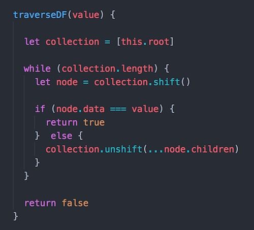 The DFS uses a Stack to traverse down the tree of nodes. We will declare the current node by shifting off the first value of the array. With this node, we will check to see if its data is equal to the value we are searching for. If its equal, we will return True and exit out of the function. If the node’s value does not match, we will push the children of that node to the front of the array if they exists. We unshift the children to the front because the DFS approach wants us to go all the way to the bottom of the tree before checking any sibling element. If no value matches after searching the whole tree, we return false at the end of our function.