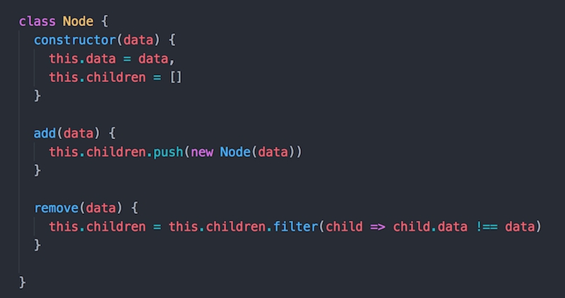 The Node class will have a constructor with two properties. It will have a data property to store the value of the node and a children property to hold an array of child nodes. The add() method can be used to add new nodes to the Tree and the remove() method will delete an unwanted child node.