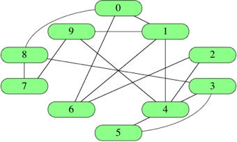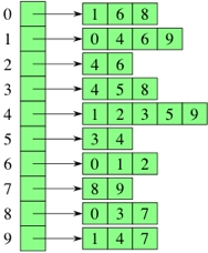[0, 1, 0, 0, 1, 0, 0, 1, 0, 0] ]With an adjacency matrix, we can find out whether an edge is present in constant time, by just looking up the corresponding entry in the matrix. For example, if the adjacency matrix is named graph, then we can query whether edge is in the graph by looking at graph[i][j]. So what's the disadvantage of an adjacency matrix? Two things, actually. First, it takes space, even if the graph is sparse: relatively few edges. In other words, for a sparse graph, the adjacency matrix is mostly 0s, and we use lots of space to represent only a few edges. Second, if you want to find out which vertices are adjacent to a given vertex , you have to look at all entries in row , even if only a small number of vertices are adjacent to vertex .